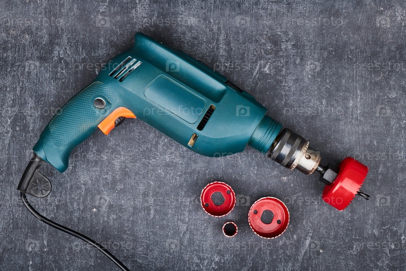 Видел корону и ручную электрическую дрель на сером фоне, вид сверху. Малая глубина резкости