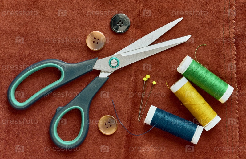 Ножницы, пуговицы, нитки и булавки на фоне замши, вид сверху