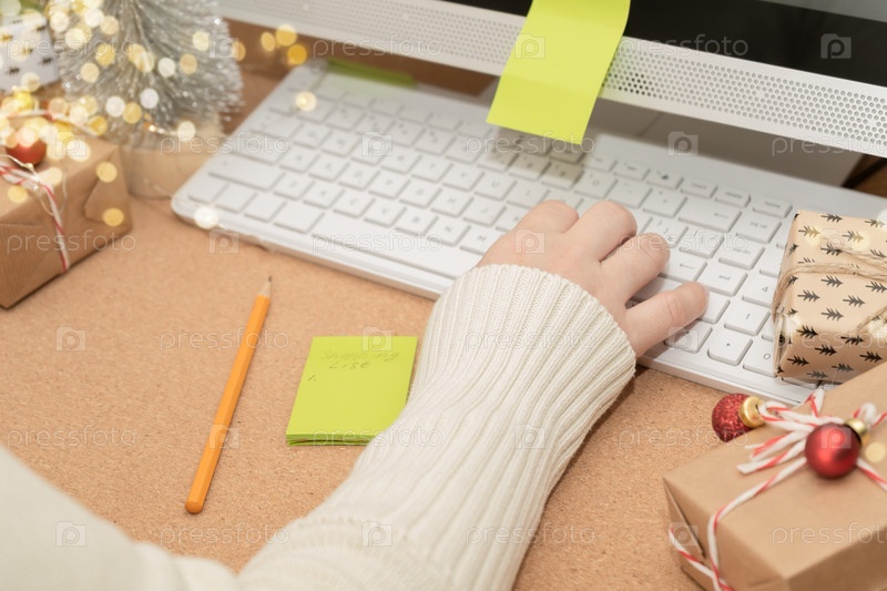 Женщина пользуется компьютером, заказывает подарки. Компьютер, подарочные коробки, праздничное оформление. Зимние праздничные распродажи