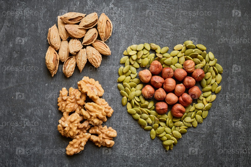 Орехи в стеклянных мисках и очищенные семена тыквы на сером фоне, диета, спортивное питание, вид сверху
