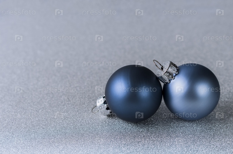 Два синих новогодних шара на блестящем серебряном фоне. Рождественская композиция