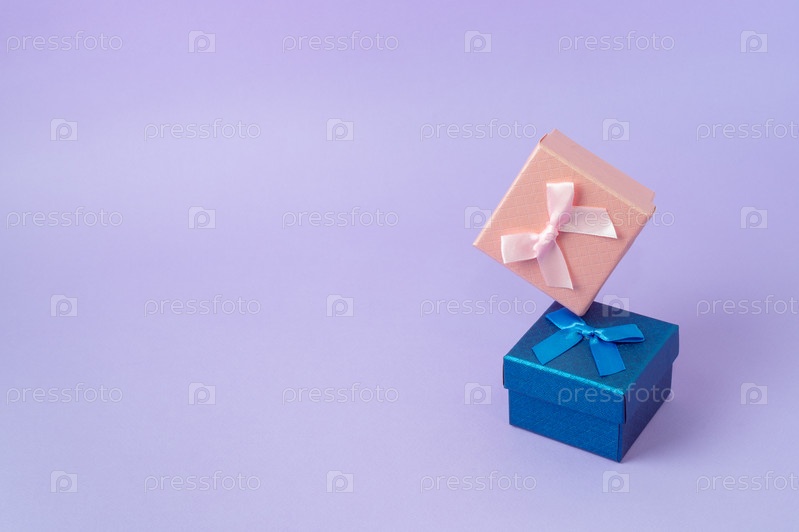 Розовые и синие подарочные коробки с бантом на фиолетовом фоне. Подарочные коробки. Копировать пространство