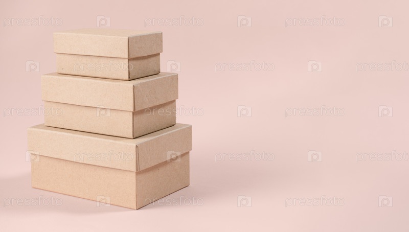 Картонные коробки для товаров и подарков на розовом фоне. Разный размер. Дизайн шаблона