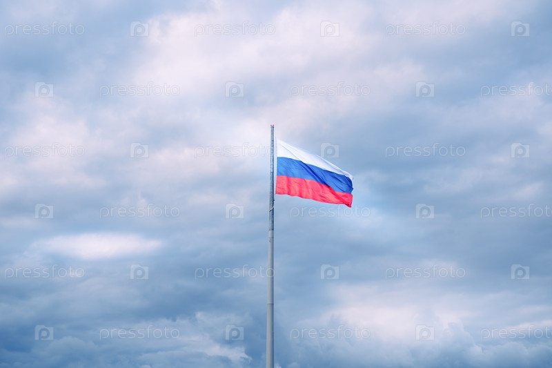 Российский национальный флаг развевается на облачном небе. Политика и новости России