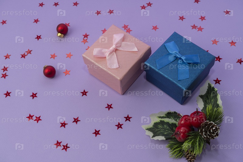 Розовые и голубые подарочные коробки с бантом на сиреневом фоне, конфетти и рождественский декор