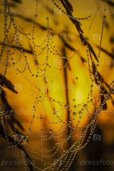 Капли росы на паутине, освещенной осенним небом перед восходом солнца