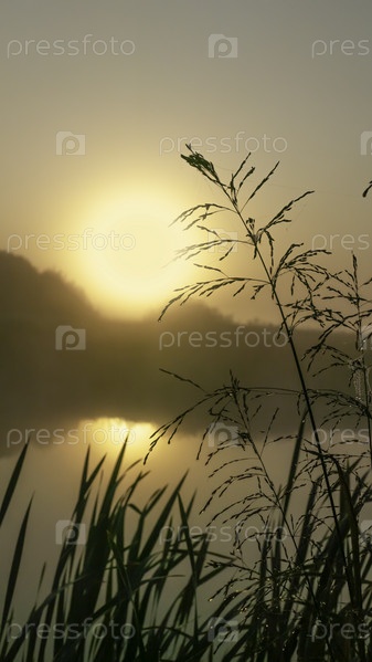 Силуэты травы на берегу озера с каплями росы на фоне восходящего солнца