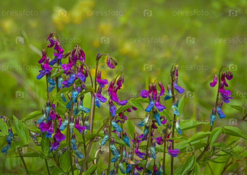 ВеснаВесенний первоцвет на лесной равнине в березовом кустепервоцвет Lathyrus vernus на лесополосе