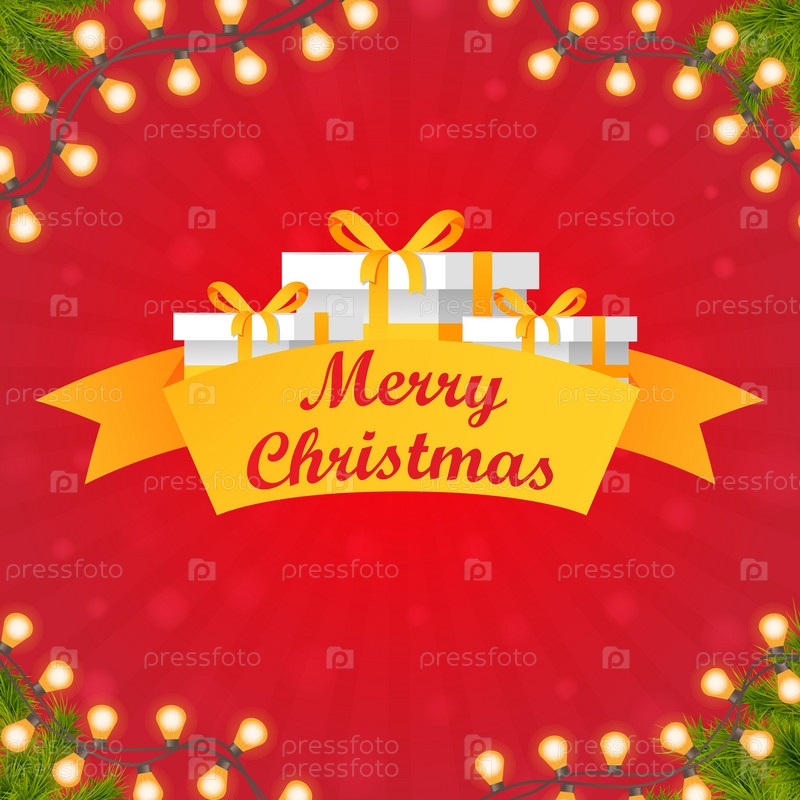 Рождественский баннер с гирляндами и подарками.Merry Christmas festive banner with garlands and gifts.Realistic vector illustration concept poster for New Year greetings.With fir branches Реалистичный векторный иллюстрационный концепт плаката для новогодн