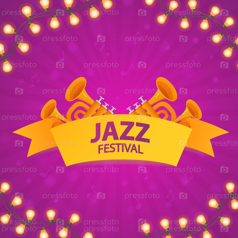 Музыкальный духовой инструмент рог. Векторная иллюстрация.Музыкальный концертный баннер.Джазовый фестиваль.Баннер фестиваля музыки джаза.Концепт музыкального плаката с трубами.Реалистичное векторное изображение.Светящая гирлянда на фиолетовом фоне