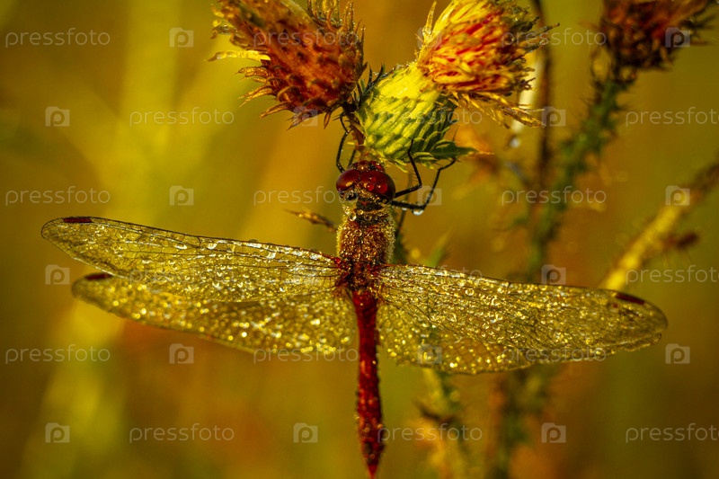 Мокрая стрекоза, покрытая каплями росы на ветвях колючего чертополоха, греется и сохнет теплым летним утром