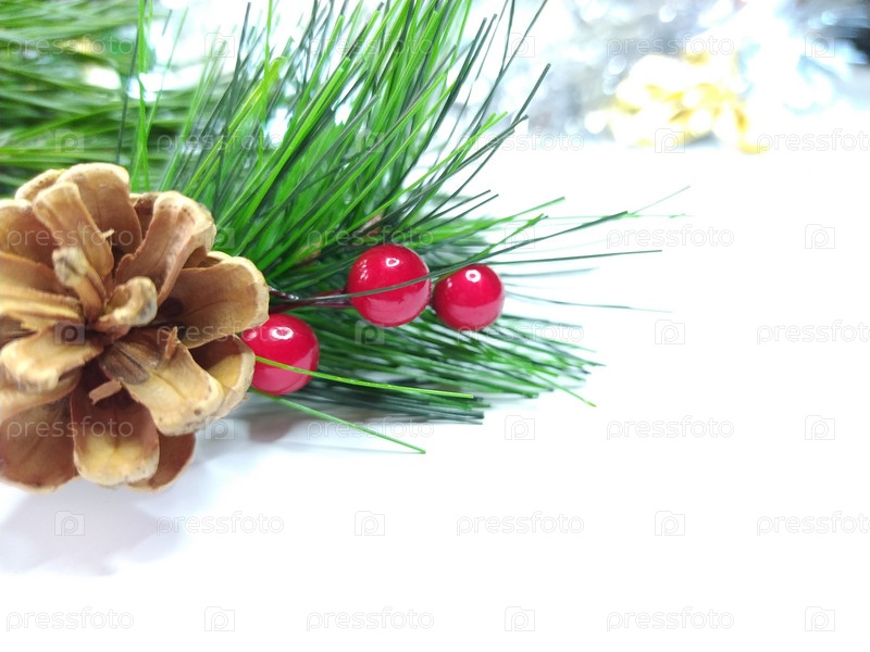 Рождественский, новогодний, прзадничный банер с местом для текста. Новогодний декор: гирлянда, мишура, шишка с ягодами, бант. Концепция праздничного настроения