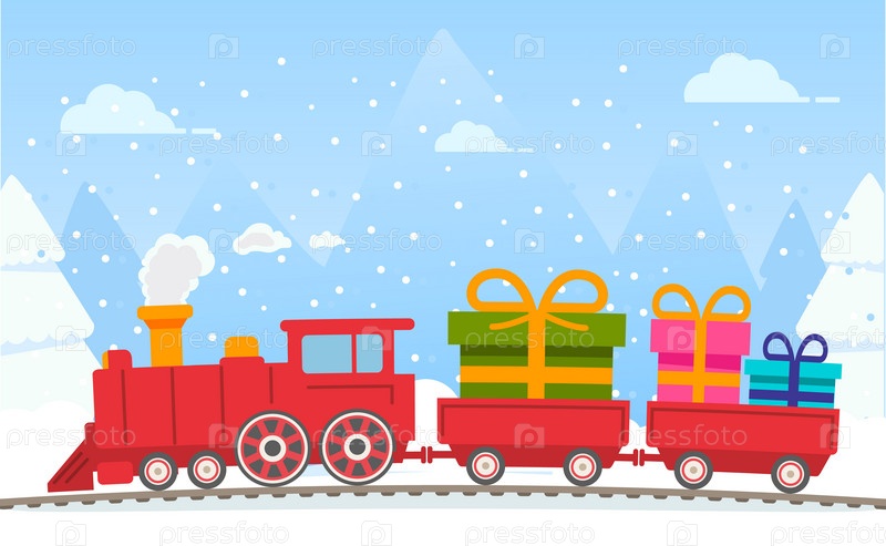Рождественский красный паровоз с вагонами с подарками. Коробка новогодних подарков с золотой лентой. Новогодний паровоз. Новогодняя железная дорога. Локомотив с подарками