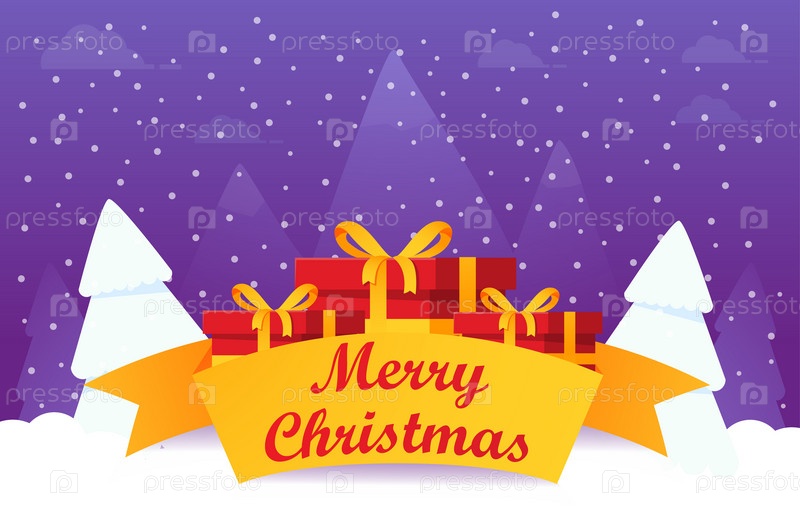 Праздничное рождественское знамя. Зимний пейзаж со снежными елями. С Рождеством Христовым надпись с золотыми лентами и красными подарочными коробками