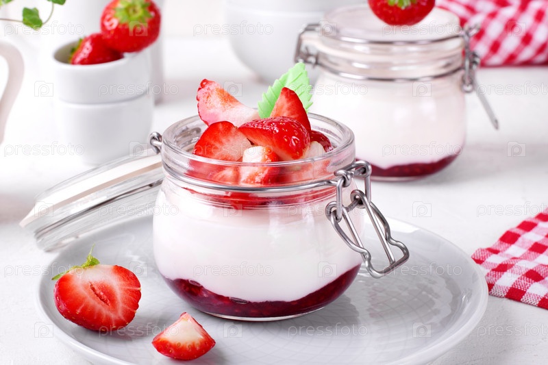 Йогурт с малиновым вареньем в банке с клубникой на белом столе. Здоровый завтрак
