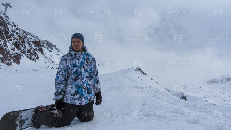 Мужчина-сноубордист стоит на коленях на лыжном склоне с привязанной доской. На заднем плане канатная дорога и очертания горных вершин