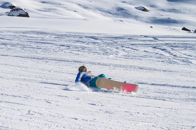 Девушка-сноубордист падает на спину на горнолыжном склоне. Получение травм в зимних видах спорта. Активный зимний отдых