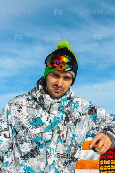 Красивый молодой человек в одежде для сноуборда, в шляпе и маске на голове, стоит на фоне голубого неба с облаками. Зимние виды спорта