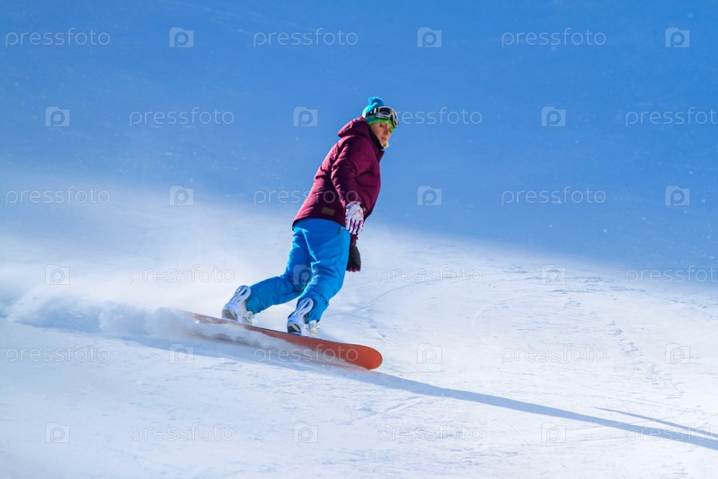 Девушка-сноубордистка скользит по склону на доске, отбрасывая снег в стороны. Одинокий сноубордист на горнолыжном склоне. Активный отдых во время зимних каникул