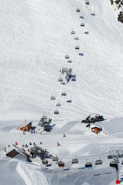 Вид сверху на две ветки кресельного подъемника. Склон под канатной дорогой со следами от лыж и сноуборда любителей внетрассового катания. Зимние виды спорта во время каникул