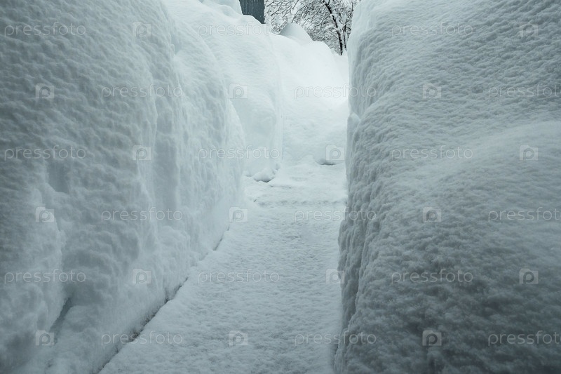 Для прохода в снежных заносах прорыт тоннель. Много снега. Снежная зима в Европе. Глобальные проблемы изменения климата