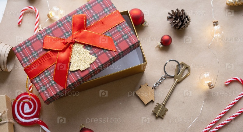 Ключ от дома с брелоком на уютном доме в подарочной коробке с упаковкой рождественского декора. Упаковать подарок на Новый год, Рождество. Строительство, проект, переезд в новый дом, ипотека, аренда, покупка недвижимости