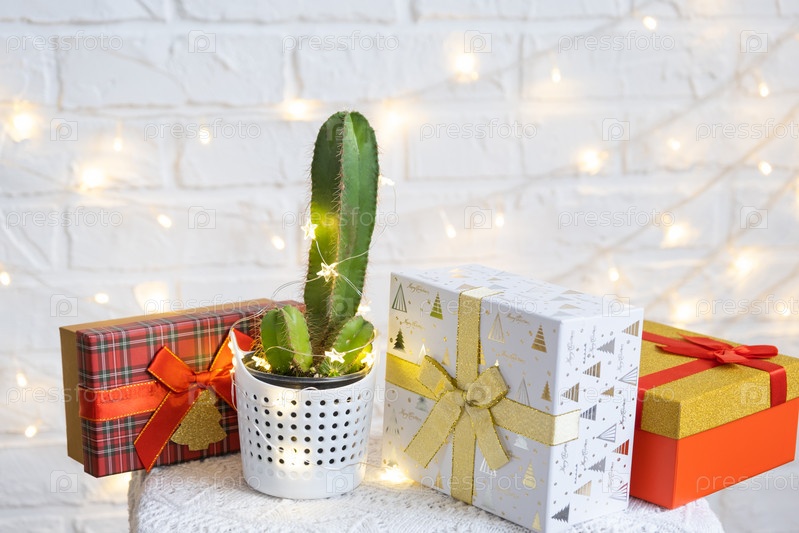 Забавный кактус в форме мужского пениса в волшебных огнях, подарочной коробке, рождественском и новогоднем декоре. Без подарков праздника не будет. Интимная депиляция для мужчин. Комнатные растения в горшках, домашний декор