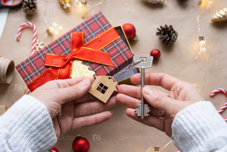 Ключ от дома с брелоком на уютном доме в подарочной коробке с упаковкой рождественского декора. Упаковать подарок на Новый год, Рождество. Строительство, проект, переезд в новый дом, ипотека, аренда, покупка недвижимости