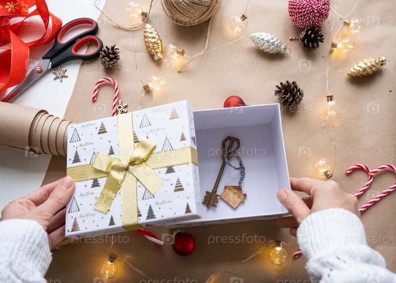 Ключ от дома с брелоком на уютном доме в подарочной коробке с упаковкой рождественского декора. Упаковать подарок на Новый год, Рождество. Строительство, проект, переезд в новый дом, ипотека, аренда, покупка недвижимости