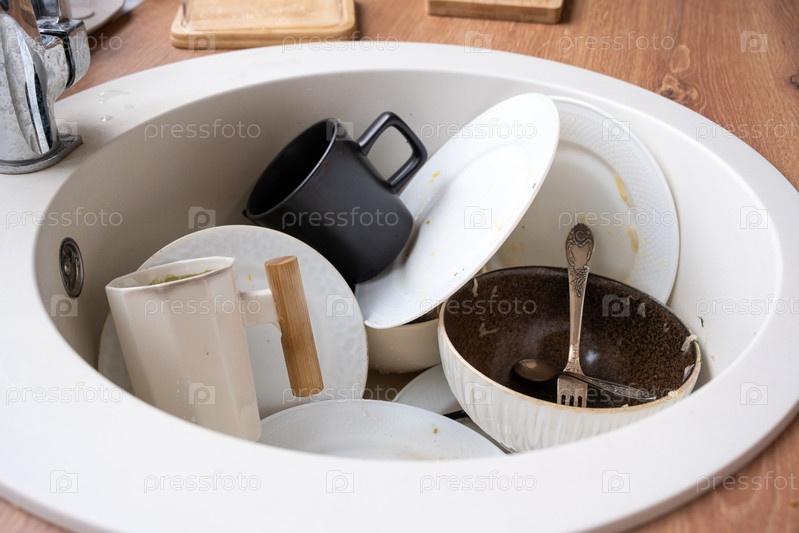 Грязная посуда в раковине на кухне, бардак после обеда, лень мыть посуду. Уборка кухни, моющие средства, клининговые услуги