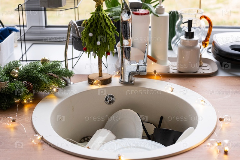 Грязная посуда в раковине на украшенной гирляндами кухне, праздник после застолья на Рождество. Беспорядок после гостей на Новый год, уборка кухни, моющие средства, клининговые услуги