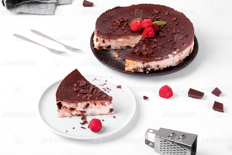 Двухслойный чизкейк с творогом и шоколадом, украшенный ягодами. Кусок безглютенового десерта на керамической тарелке