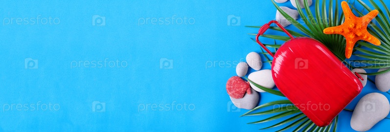 Веб-баннер с плоской дорожкой лежал с красным чемоданом, камнями, морскими звездами, морскими раковинами и зелеными пальмовыми листьями на синем фоне. Концепция летних каникул. Макет с копией пространства