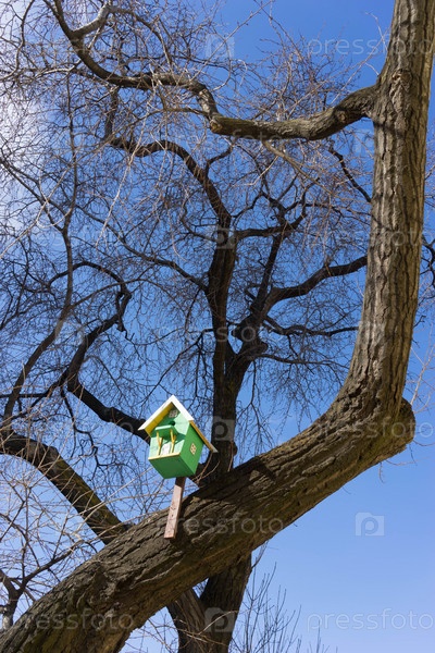 Городской пейзаж с домиками для птиц на фоне деревьев без листьев