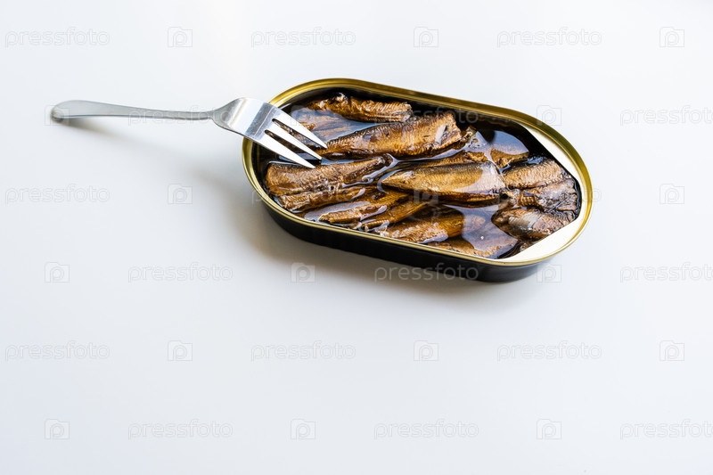 Шпроты с маслом в открытой жестяной банке и вилка на белом фоне, крупным планом