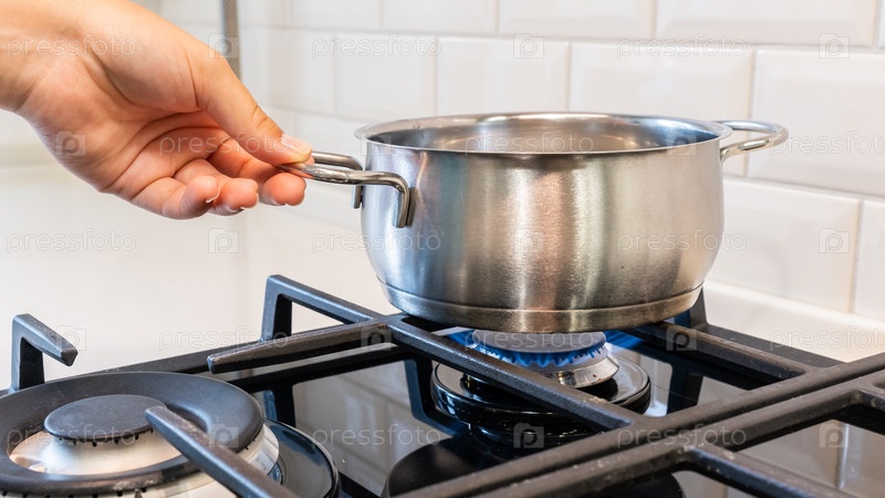Женская рука держит кастрюлю, стоящую на газовой горелке плиты