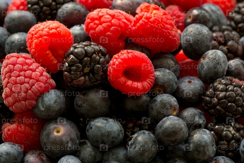 Свежая сочная органическая черника, малина, ежевика, крупным планом