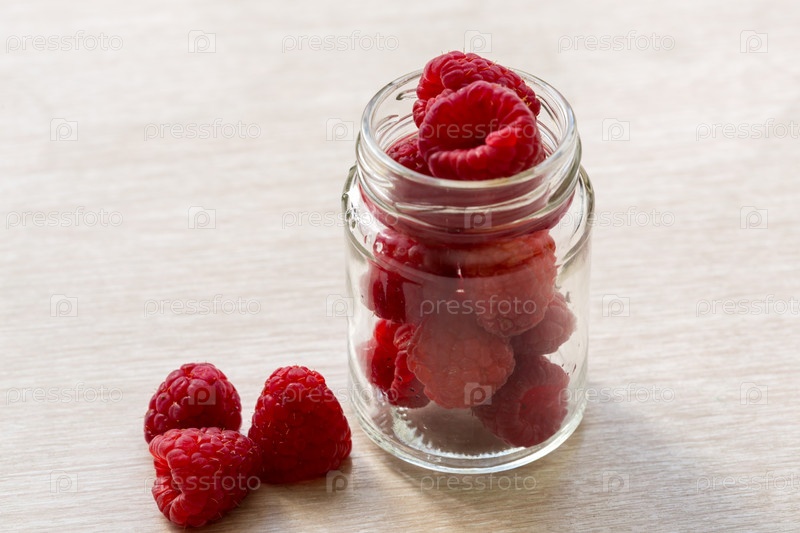 Стеклянная банка с малиной и тремя ягодами на деревянном столе. Летняя спелая сочная малина