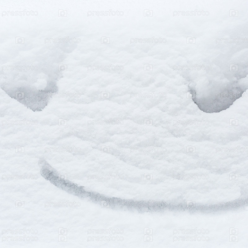Смешная снежная улыбка, нарисованная на фоне белого снега, счастливая зимняя концепция