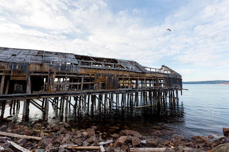 Старый деревянный пирс в селе Териберка, Кольский полуостров, Россия