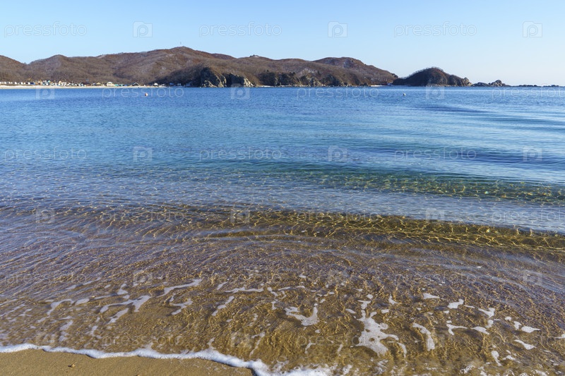 Морской пейзаж с прозрачными волнами и береговой линией в снегу