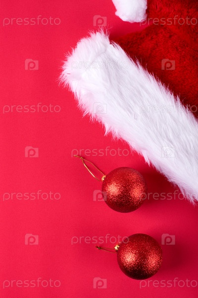Шляпа Санты и две безделушки на красном фоне. Монохромная плоская рождественская и новогодняя планировка с копией пространства