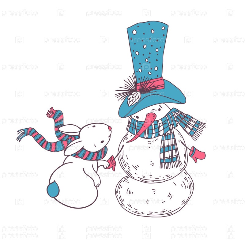 Симпатичный снеговик и забавный кролик. Вектор. Рождественские праздничные персонажи. Идеально подходит для оформления открыток, приглашений, наклеек