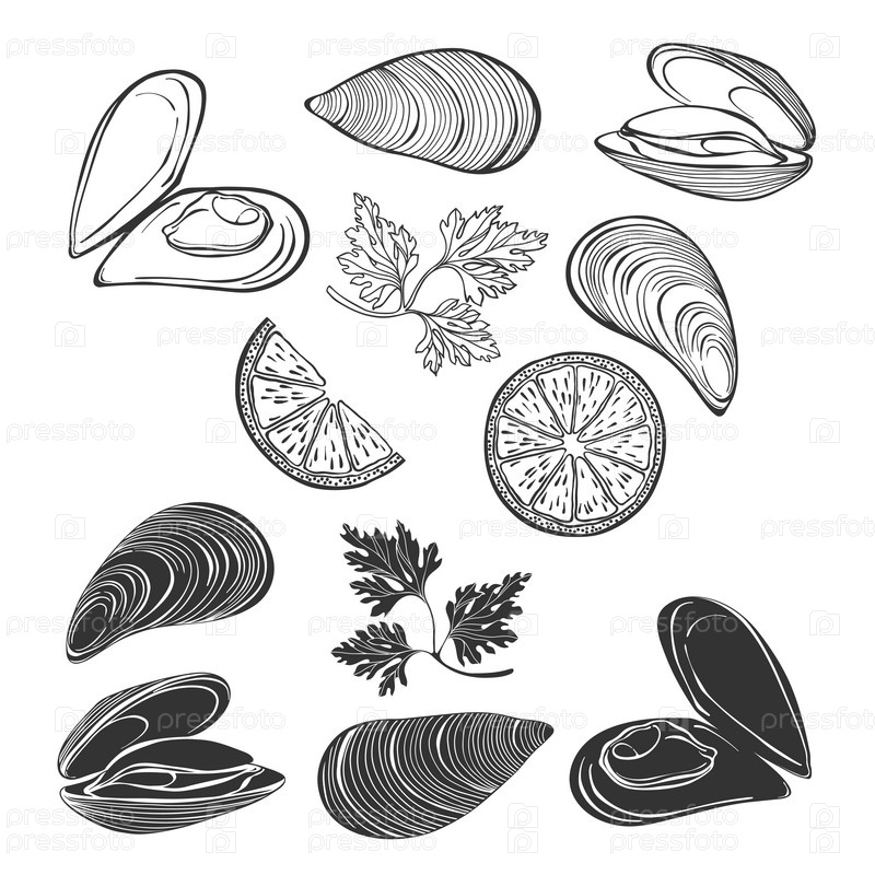 Мидии, петрушка и дольки лимона. Векторная иллюстрация, изолированные элементы на белом. Концепция логотипа, меню, печати открыток, приглашения