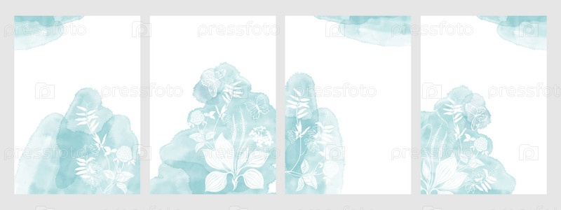 Готовый дизайн с полевыми цветами, бабочкой, синим акварельным всплеском и местом для текста. Векторный макет декоративной открытки или приглашения дизайн фона, дизайн обоев. Четыре разные версии