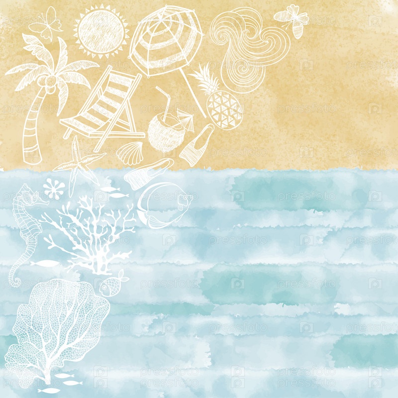 Морской фон. Акварельная иллюстрация с голубыми волнами, песчаным пляжем и графическими элементами. Может использоваться для создания открытки или пригласительного билета