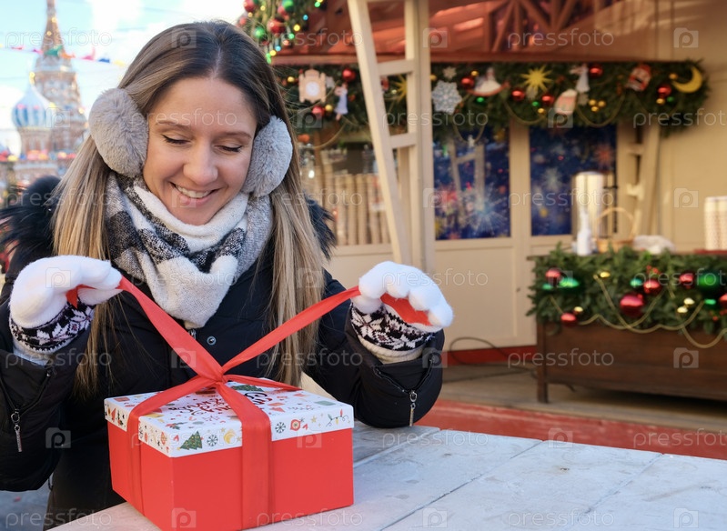 Женщина портрета с покупками коробки подарков на традиционной рождественской ярмарке. Концепция рождественских подарков
