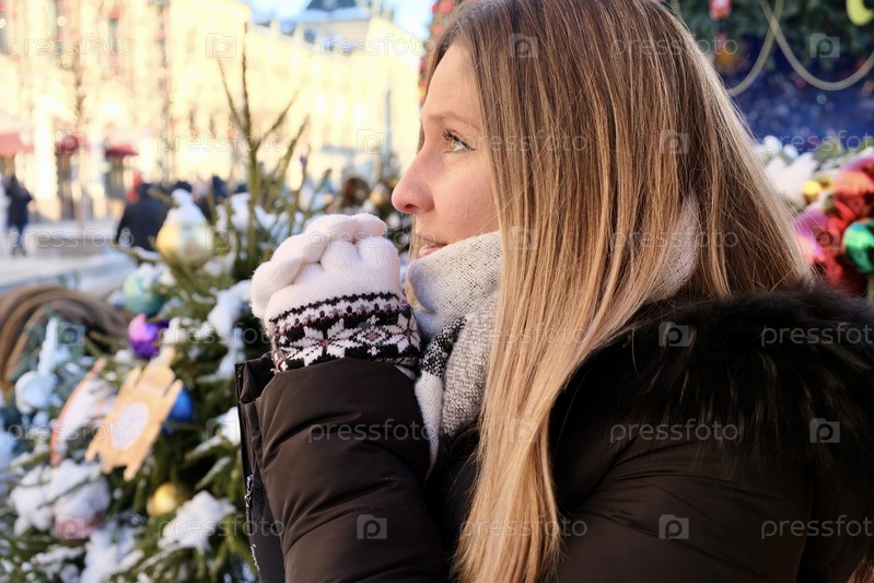 Девушка на новогодней ярмарке греет руки на морозе. Зима, Рождество и Новый год