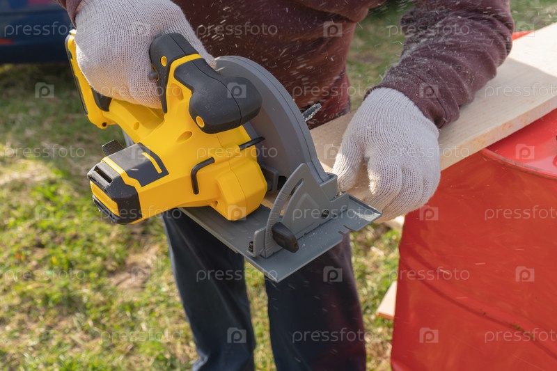 Рабочий распиливает доску циркулярной пилой при резке деревянной доски
