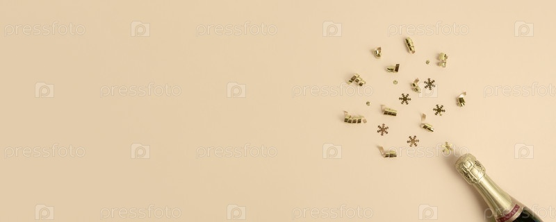 Бутылка шампанского, конфетти, растяжки для вечеринок на пастельном фоне. Рождество, новый год концепции. Баннер, место для копирования